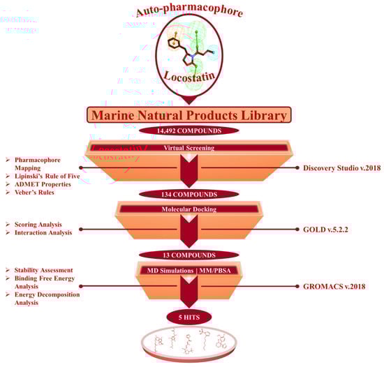 The auto-pharmacophore model generated from the above step was utilized as a 3D-query to retrieve the compounds, complementing the features of the model, from a Marine Natural Products (MNP) library. The MNP library comprising a total of 14,492 natural compounds was screened using the generated model by employing the Ligand Pharmacophore Mapping module in DS [48]. The resulting MNPs complementing the pharmacophore features were filtered by Lipinski’s Rule of Five (Ro5) [33,49] and Veber’s rules [34], followed by further filtering their absorption, distribution, metabolism, excretion and toxicity (ADMET) properties. Accordingly, the Filter by Lipinski and Veber Rules and ADMET Descriptors modules implanted in DS were employed for retrieving the drug-like MNPs. Subsequently, the obtained drug-like MNPs were escalated for the next process of molecular docking with the ligand-binding pocket of RKIP.