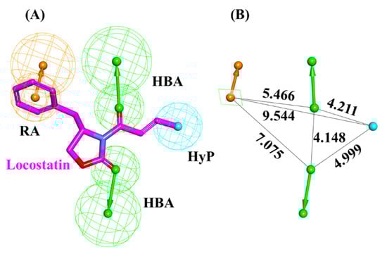 Auto-pharmacophore model exploiting locostatin. (A) Pharmacophore features demonstrated by locostatin- HBA (hydrogen bond acceptor), HyP (hydrophobic) and RA (ring aromatic). (B) Interfeature distance between the mapped features of locostatin.