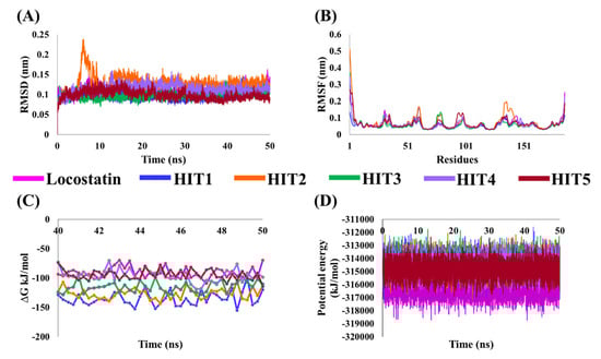 Molecular dynamics (MD) simulation analyses plots demonstrating the (A) backbone root mean square deviation (RMSD), (B) backbone root mean square fluctuation (RMSF), (C) binding free energy (∆Gbind) values and (D) potential energy of the reference (REF) compound, locostatin and identified hits with RKIP.