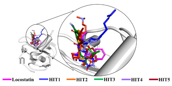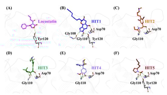 The characteristic binding interaction of the five hits and locostatin was examined on the basis of the average structure extracted from last 10 ns. The REF compound, locostatin, was observed to demonstrate one hydrogen bond with residue Tyr120 (bond length: 2.73 Å) (Figure 6A). In addition, REF also formed hydrophobic bonds with residues Trp84 (π–π stacked, bond length: 4.48 Å; π-alkyl, bond length: 4.97 Å), Val107 (π-alkyl, bond length: 5.05 Å) and Tyr181 (π–π T-shaped, bond length: 4.93 Å) (Figure S2A). The residues Asp70, Ala73, Pro74, Tyr81, His86, Gly108, Gly110, Pro111, Pro112, His118, Leu180 and Leu184 also supported locostatin, characterized by carbon–hydrogen bonds and van der Waals interactions (Figure S2A).
