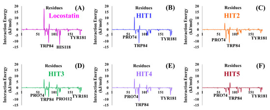 Energy decomposition of individual residues in RKIP contributing to the total binding free energy of (A) Locostatin, (B) HIT1, (C) HIT2, (D) HIT3, (E) HIT4 and (F) HIT5, computed by MM/PBSA.