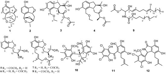 Our previous investigation on the marine sponge-derived fungus Pestalotiopsis heterocornis XWS03F09 has resulted in the discovery of heterocornols A–P [,], pestaloisocoumarins A and B, isopolisin B, and pestalotiol A []. For exploring the chemical diversity of microorganisms using the OSMAC strategy, we reinvestigated the secondary metabolites of the strain XWS03F09, with additional 3% artificial sea salt to solid rice medium. Further chemical exploration resulted in the isolation of eight new polyketide derivatives, heterocornols Q–X (1–8), and one new ceramide (9), together with three known analogues, pestalone (10) [], and pestalachlorides A and B (11 and 12) []. The isolated compounds (1–9 and 12) were evaluated for the cytotoxic, antimicrobial, and anti-inflammatory activities in vitro. Here, we report the details of the isolation, structure elucidation, and biological activities of these compounds.
