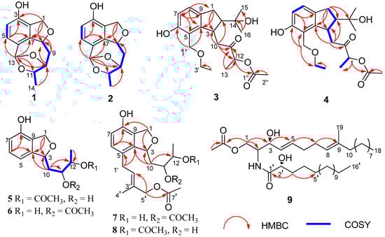 The following are available online at https://www.mdpi.com/article/10.3390/md19110585/s1, Figures S1–S64: 1H, 13C, HSQC, HMBC, COSY, NOESY, IR, and HRESIMS spectra of the new compounds 1–9.