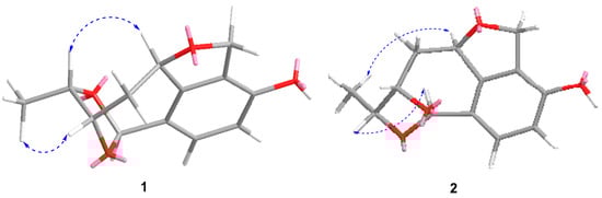 Unfortunately, in the NOESY spectrum, NOE interactions could not be used to determine the different stereoscopic relationship between 3 and 4. The apparent difference between 3 and 4 are the opposite Cotton effects (Figure 4) and the opposite optical rotations. To further assign the absolute configuration of 3 and 4, ECD calculations were performed (Figure 4, Figures S28 and S29). According to the literature [,], the ECD band between 260 and 285 nm is allied with the 1Lb transition of the aromatic chromophore. The region of the spectrum from 260 to 285 is diagnostic of the configuration of aromatic compounds. The experimental ECD spectrum for compound 3 displays positive Cotton effects at 278 nm and negative effects at 208 and 300 nm. The calculated ECD spectra for 3 with an R configuration at C-12 showed a negative Cotton effect between 280 and 320 nm. The CD spectrum of 4 showed negative (229 and 240 nm) and positive (300 and 208 nm) Cotton effects, indicating that the C-12 of 4 was represented as S. As a result, the calculated ECD curve for 2R, 3R, 12R-3 was the best match with 3, and 2R, 3S, 12S-4 was the best match with 4 (Figure 4 and Figures S30–S35).