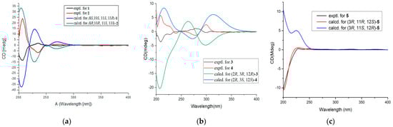 Comparison between calculated and experimental ECD spectra of 1–5. (a) for 1 and 2; (b) for 3 and 4; (c) for 5.