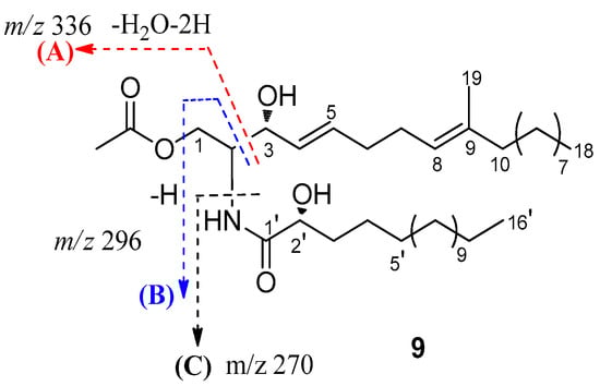 Compound 9, an amorphous powder, possessed a molecular formula of C37H69NO5 based on its 13C NMR data and HRESIMS m/z 608.5251 [M + H]+ (Figures S58 and S59). The 1H NMR (Table 2 and Figure S60) spectrum of 9 exhibited an amide proton [δH 6.91 (NH, d, J = 8.0 Hz)], two disubstituted olefinic protons [δH 5.77 (1H, dt, J = 15.4, 6.4 Hz) and δH 5.49 (1H, dt, J = 15.4, 6.4 Hz)], a trisubstituted olefinic proton [δH 5.08 (1H, d, J = 6.4 Hz)], one oxygenated methylene [δH 4.32 (1H, dt, J = 8.1, 4.0 Hz) and δH 4.19 (1H, dt, J = 8.1, 3.8 Hz)], two oxygenated methine [δH 4.20 (1H, brs) and δH 4.11 (1H, dt, J = 8.1, 3.8 Hz)], aliphatic methylenes (δH 1.24~1.42). Additionally, resonances for three methyl groups, including an olefinic methyl group (δH 1.58, brs) and two terminal methyl groups [δH 0.88 (6H, t, J = 7.0 Hz)], were observed. Analysis of the 13C NMR data and HSQC spectra (Figures S61 and S62) revealed the existence of characteristic signals resonances including an amide carbonyl at δC 173.9, methine carbons at δC 53.0, and aliphatic carbons at δC 22.7~29.7. Detailed analysis of these aforementioned data of 9 suggested it was very similar to those of the previously reported ceramide compound [], (2S, 2′R, 3R, 4E, 8E)-N-2′-Hydroxyhexadecanoyl-2-amino-9-methyl-4, 8-octadecadiene-1,3-diol. The major differences are the presence of an additional acetyl group of protons (δH 2.05, 20.9, and 171.3) in 9, indicating that 9 was a 1-O-acetyl derivative of ceramide compound. Combined with the 2D NMR spectra data, an acetyl group was suggested at C-1 in 9, which was further confirmed by the HMBC correlation of H-1 (δH 4.32 and 4.19) with C-2 (δC 53.0), C-3 (δC 73.0), and C-1″ (δC 171.3) (Figure 2 and Figure S63). Furthermore, based on the J values for H-4 (δH 5.49, dd, J = 15.4, 6.4 Hz), the geometries of the double bonds for H-4/H-5 was trans. Compared to the NMR data from (2S, 2′R, 3R, 4E, 8E)-N-2′-Hydroxyhexadecanoyl-2-amino-9-methyl-4,8-octadecadiene-1,3-diol [,], the chemical shift value of the olefinic methyl group at C-9 (δC 16.0) in compound 9 suggests that the double bond at C-8 is E geometry. The length of the fatty acid was determined by the characteristic peaks at m/z 253, 296, 314, 336 in the EI-MS (Figure 5 and Figure S59) []. According to the literature [] and our NMR data, the chemical shift of C-3 and C-2′ in ceramide compound were almost superimposed with configuration of C-3 and C-2′. Comparing the coupling constant of H-2 and H-3, and 13C NMR data of the synthetic (2S, 2′R, 3R, 4E, 8E)-N-2′-Hydroxyhexadecanoyl- 2-amino-9-methyl-4, 8-octadecadiene-1,3-diol, the configuration of 9 was deduced. Thus, 9 was determined and named pestalotiopsisamide.