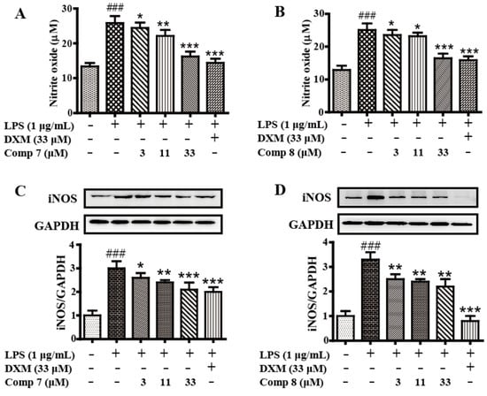 The anti-inflammatory activity of compounds 7 and 8. Cells were pretreated with both compounds 7 and 8 differently concentrations (0, 3, 11, 33 μM) and DXM (33 μM) for 2 h, then stimulated with or without LPS (1 μg/mL) for 24 h. The culture medium was collected to detect the concentrations of nitrite with Griess agent (A,B). Protein levels of iNOS were evaluated by Western blot (C,D). The data represent the means ± S.E. of three independent experiments. (### p < 0.001 was compared to control. * p < 0.05, ** p < 0.01, *** p < 0.001 compared to LPS group).