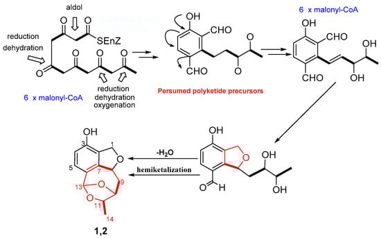 Polyketides are common biosynthetic precursor in the process of synthesizing aromatics and macrolides in microorganisms. Compounds 1–8 were formed via different polyketide precursors by polyketide synthases. Presumed polyketide precursors are considered to be biogenetically derived from acetyl-CoA by reduction, dehydration, oxygenation, and cyclization to form the core skeleton. Next, presumed polyketide precursors underwent reduction to form a vicinal diol (an intermediate), which could generate a dihydroisobenzofuran through reduction and dehydration. Finally, the dihydroisobenzofuran undergoes dehydration and nucleophilic addition to yielded 1 or 2 (Scheme 1), featuring a novel 6/5/7/5 tetracyclic polyketide derivatives.