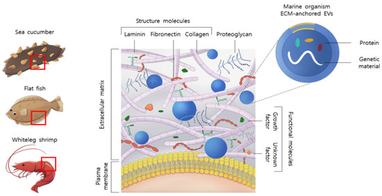 However, marine-derived EV bio-application research is still insufficient. Most of the latest research on marine EVs has been applied to the ecology and ecosystem related to EVs released from marine bacteria [24,25]. Therefore, we aimed to study marine-derived EVs that can be used in regenerative medicine. The marine ECM is composed of structural molecules, such as collagen, fibronectin, laminin, proteoglycan, and functional molecules that can act as growth factors, and it was expected that EVs would be anchored between them (Figure 1). Therefore, we decided to use the method of extracting EVs from the ECM, which was previously studied for marine organisms that are difficult to extract from pure biofluid because seawater contains bacterial EVs [24,25]. In this study, we focused on extracting EVs from marine organisms, not marine bacteria, and confirmed their biological activation. In addition, we selected fish, crustaceans, and echinoderms among representative marine organisms to confirm their applicability to a wide range (Figure 1). Here, we identified EVs embedded in the marine ECM and their anti-inflammatory effects.