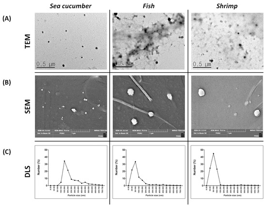 Marine organism-derived EVs were visualized using TEM (H-7500; Hitachi, Tokyo, Japan) and SEM (MIRA 3 LMH; TESCAN, Brno, Czech Republic). Electron microscopy analysis was performed according to a previously described protocol. The mEV suspension (100 μg) was fixed with 4% paraformaldehyde for 30 min and washed with PBS. Subsequently, fixed EVs were dehydrated with an ascending sequence of ethanol (80%, 90%, 95%, and 100%). The mEV suspension was dropped on a cover glass or carbon-coated grid (TED PELLA, Redding, CA, USA) and left in fume hoods for 24 h.