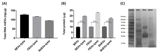 Size and morphological experiments confirmed that marine organism-derived particles have a similar shape and size to EVs, but since there is a possibility that these are ECM residues or limestone, we tried to confirm whether they are EVs by discovering genes and proteins inside the vesicles. In general, since mammalian EVs contain genes and proteins for intercellular communication and homeostasis [15,16], it was expected that mEVs would also have a similar composition. A large amount of genetic material was extracted from mEV cargo using TRIzol, and chloroform. In this study, we did not conduct experiments on the size and sequencing of the extracted genetic material (Figure 3A), but we plan to confirm this through a follow-up study. Further, we compared protein concentrations before and after destroying vesicles using cell membrane lysis buffer. When measuring the protein concentration with destroyed vesicles, sea cucumber ECM-anchored EVs (SEVs) measured 1.95 times higher than before; fish ECM-anchored EVs (FEVs) measured 2.26 times higher than before; and shrimp ECM-anchored EVs (ShEVs) measured 1.75 times higher than before (Figure 3B). In several studies, structural molecules such as collagen were mainly observed between 100 and 200 kDa in the marine ECM [33,34,35], but the mEV cargo contained proteins with various molecular weights; mainly low molecular weight proteins were observed (Figure 3C). The results confirmed that mEVs consist of a lipid layer structure that protects genetic materials and protein cargo. This packaging method is used to release materials manufactured inside the cell to the outside [36,37]. To date, it has been mainly found in terrestrial EVs.