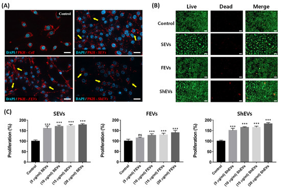 To investigate cell endocytosis and cell toxicity, fluorescence analysis was performed. PKH-26 fluorescent dye stained the membrane of mEVs via non-covalent binding with the membrane [38]. The internalization of mEVs was detected using cell-tracking methods. Labeled mEVs were taken up into RAW 264.7 cell membrane to identify the cell response, such as a necrosis and detachment after endocytosis. In the control group, the cell membrane was directly stained, and the other groups observed the uptake of the stained mEVs. In the mEVs group, red-stained vesicles were embedded in the cell membrane, but not in the control group. The images confirmed that PKH-26-labeled mEVs could easily enter into the cell without any stimulation or cell detachment (Figure 4A). In addition, macrophages were treated with mEVs for 24 h to observe the viability changes. In SEV- and ShEV-treated cells, a large number of colonies were confirmed compared to that in the control group, and a few colonies were also observed in the FEV group. However, necrosis was not observed in any group (Figure 4B). Subsequently, the effect of mEVs on macrophage cell proliferation was examined, and the degree of mitochondrial activity was measured after treatment with various concentrations for 24 h. In the SEV group, the activity increased from 161% at 5 μg/mL to 178% at 20 μg/mL. In the FEV group, a statistically significant increase was confirmed from 114% at 10 μg/mL, and about 139% proliferation was increased at a concentration of 20 μg/mL. The activity increased in the ShEV group by 151% at 5 μg/mL and up to 182% at 20 μg/mL (Figure 4C). These results confirmed that mEVs showed no cytotoxicity and increased proliferation in a dose-dependent manner. Published descriptions of cytotoxicity and proliferation experiments conducted with land animal-derived EVs yielded similar results to those seen in the group treated with mEVs. In addition, no toxicity due to enzymes and reagents used to extract EVs from the marine-derived ECM was observed.