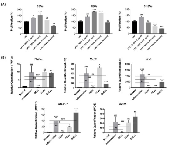 Further, the expression of inflammatory chemokine and cytokine genes was compared. The mEV concentrations, when measuring the highest proliferation rate (SEVs: 10 μg/mL, FEVs: 10 μg/mL, and ShEVs: 5 μg/mL), were chosen and treated for 48 h. The relative quantification of messenger RNA (mRNA) of tumor necrosis factor-α (TNF-α), interleukin-1β (IL-1β), IL-6, macrophage chemoattractant protein-1 (MCP-1), and inducible nitric oxide synthase (iNOS) was performed (Table 1).