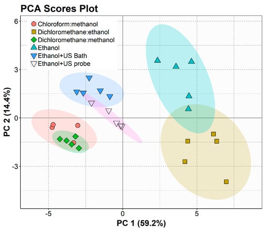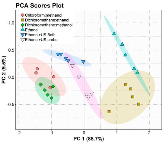 For a more detailed interpretation of the data, statistical analysis was also performed using the relative abundances of lipid species in the different extracts, shown in Supplementary Materials, Table S5. As observed in Figure 3, the PCA plot also shows the clustering of the CM and DM extracts and the E and DE extracts on opposite sides of the plot. However, it is possible to observe a tighter cluster of the extracts obtained using ultrasound and a greater proximity to the cluster of chlorinated solvents.