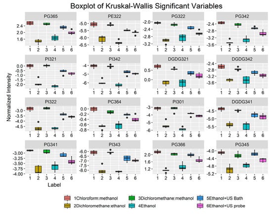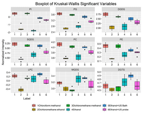 Boxplot of the 16 most discriminating polar lipid species for PC1 from lipid extracts of Nannochloropsis oceanica obtained using different solvent systems and ultrasound-assisted methodologies. For all lipid species q < 0.05. The thick bar is the median value, and the dots are the outliers of five replicates. PC—phosphatidylcholine; PE—phosphatidylethanolamine; PI—phosphatidylinositol; PG—phosphatidylglycerol; DGDG—digalactosyl diacylglycerol.