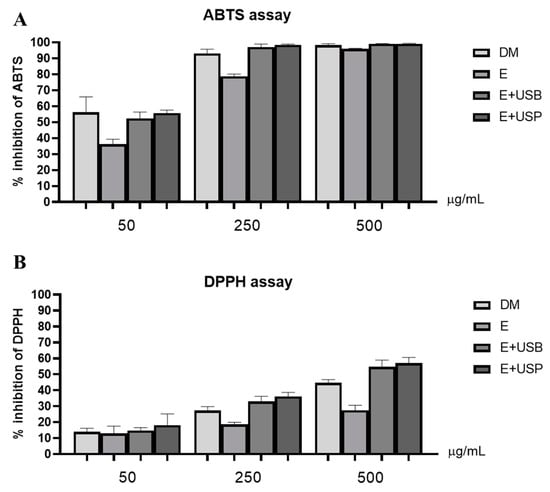 Percentage inhibition of ABTS●+ (A) and DPPH● (B) obtained in the presence of polar lipid extracts of Nannochloropsis oceanica extracted with dichloromethane/methanol (DM), ethanol (E), ethanol assisted by an ultrasonic bath (E + USB), and ethanol assisted by an ultrasonic probe (E + USP) (50, 250, and 500 μg/mL in ethanol) after 120 min of reaction. Values are presented as the average of three assays (n = 3) ± standard deviation.