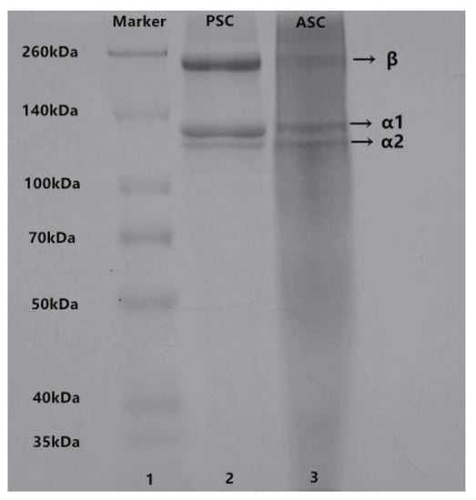 The electrophoretic patterns of ASC and PSC from lizardfish scales are illustrated in Figure 1. It is clear that ASC and PSC show similar electrophoretic patterns as both consist mainly of two different types of α-chains (α1 and α2) and dimeric β-chains. The molecular weight of collagen was analyzed using Quantity One 4.6.0 software (Bio-Rad Laboratories, Hercules, CA, USA); we found that the molecular weight of ASC (α1-MW, 137 kDa; α2-MW, 127 kDa) was slightly higher than that of PSC (α1-MW, 135 kDa; α2-MW, 123 kDa), which can be attributed to the removal of telopeptide regions of the PSC []. The protein patterns of ASC and PSC were similar to those of the collagen obtained from tilapia skin [] and Pacific cod skin []. Although pepsin removed the cross-link-containing telopeptide, the electrophoresis patterns showed that PSC contained a higher intensity of β-chains than ASC, indicating that PSC has high molecular cross-linkages [,]. Moreover, the ratio of α1 and α2 was calculated by Image J software (VERSION 1.8.0, National Institute of Mental Health, Bethesda, MD, USA); specifically, the ratios of α1 and α2 for ASC and PSC were 1.86 and 2.23, respectively, both close to 2:1, implying that ASC and PSC extracted from lizardfish scales are type I collagen ([α1]2α2) [].