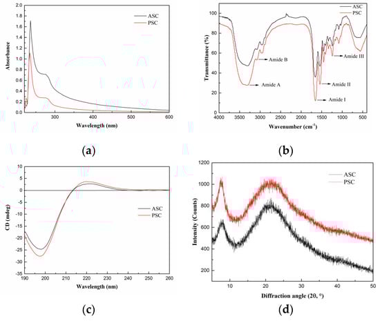 Spectroscopy properties of ASC and PSC. (a) UV absorption spectra, (b) Fourier transform infrared spectroscopy, (c) circular dichroism, and (d) X-ray diffraction. The experiment was conducted only once (n = 1).