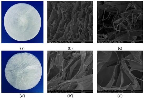 The morphology of collagen is vital for assessing its potential application in biomedicine []. The collagen solution obtained from lizardfish scales was lyophilized, and the morphology of collagen sponges was observed by scanning electron microscopy (SEM) (Figure 3). As shown in Figure 3a,a’, ASC and PSC were observed as white sponges with loose, uniform, and porous structures observed by the naked eye. ASC and PSC surfaces under SEM were partially wrinkled, which may be attributed to water being sublimated during the freeze-drying process []. The SEM images showed that ASC and PSC had a similar multilayer overlapping and porous microstructure. However, there were some differences in the structure between ASC and PSC under SEM observation. As observed at a magnification of 400×, ASC exhibited a compact sheet and porous structure (Figure 3b), while PSC had a loose and large sheet structure (Figure 3b’); ASC exhibited a more porous structure than PSC. It was clearly visible at higher magnifications (800×) that ASC had considerable fibrillary structure and a small number of sheet structures (Figure 3c), while PSC had large sheet-like film structures (Figure 3c’).