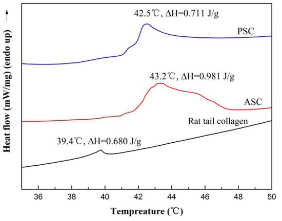 Differential scanning calorimetry (DSC) was used to measure the maximum transition temperature (Tmax) of collagen. The DSC curves of collagen from the lizardfish scales are shown in Figure 4. It was observed that the Tmax of collagen from lizardfish scales was higher than that of rat tail collagen. The Tmax values of rat tail collagen, ASC, and PSC were 39.4 °C, 43.2 °C, and 42.5 °C, respectively. The Tmax of ASC was higher than PSC and the rat tail collagen, and the ΔH of ASC (0.981 J/g) was also higher than the PSC (0.711 J/g) and the rat tail collagen (0.680 J/g).