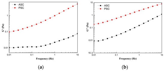 The frequency dependence of the rheological parameters elastic modulus (G′) and viscous modulus (G″) from lizardfish scales ASC and PSC was assessed using dynamic frequency scan tests. The G′ was defined as the elasticity of protein, and G″ was defined as the viscous behavior of the protein []. Figure 6 exhibits the dynamic frequency sweep tests of ASC and PSC, and the G′ and G″ values of ASC and PSC showed an increasing trend as the frequency increased from 0.01 to 10 Hz. The G′ and G″ values of PSC are higher than the corresponding G′ and G″ values of ASC between 0.01 and 10 Hz. As shown in Figure 6a, the increase in the G′ value of PSC was higher than that of ASC in the test frequency range 0.01–10 Hz.