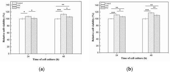 Relative cell viability of HaCaT and MC3T3-E1 cells after 24 h and 48 h of incubation in ASC and PSC. (a) is HaCaT cells; (b) is MC3T3-E1 cells. Values represent the means ± standard deviations (SD) of duplicate assays (n = 6). * p < 0.5, ** p < 0.01, *** p < 0.001.