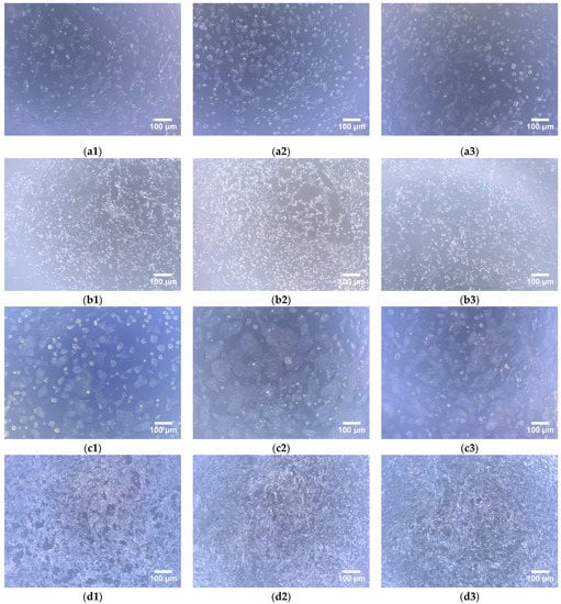 Morphology of HaCaT and MC3T3-E1 cells on lizardfish scales collagens (40× magnifications). (a1–a3) HaCaT cells for 24 h cell culture, (a1) is control, (a2) is ASC, and (a3) is PSC; (b1–b3) MC3T3-E1 cells for 24 h cell culture, (b1) is control, (b2) is ASC, (b3) is PSC; (c1–c3) HaCaT cells for 48 h cell culture, (c1) is control, (c2) is ASC, and (c3) is PSC; (d1–d3) MC3T3-E1 cells for 48 h cell culture, (d1) is control, (d2) is ASC, and (d3) is PSC.