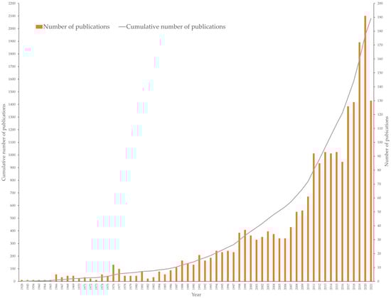 A total of 2080 fucoxanthin research articles were published from 1928 to June 2021 (Figure 1). According to the Scopus database, the first fucoxanthin research article was published in 1928. A small number of publications per year were observed (<10 units except 1976) until 1986. The amount of publication has doubled (around 20 units) per year since 1994. After that, the annual publications have elevated steadily and generated an immediate increase in the cumulative total publications. A remarkable increase in the number of publications was detected starting in 2017. In 2017, the number of publications exceeded 100 for the first time. The last decade’s publication on fucoxanthin corresponded to 64.90% (1350 publications) of the total publications since 1928. In addition, the previous years (2017 to June 2021) recorded 35.96% of the total publications on fucoxanthin. These findings indicated that a strong interest in fucoxanthin research occurred recently.
