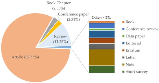 The major publications on fucoxanthin were articles (82.55%) (Figure 2). Reviews were the second-largest amount of publications, which constituted 11.25% of the total publications. This is followed by book chapters (2.55%) and conference papers (2.31%). Other documents such as books, conference reviews, data papers, editorials, errata, letters, notes, and short surveys accounted for less than 2% of the total publications.