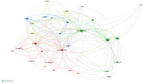 A distribution by communities of 31 countries with at least 20 articles on fucoxanthin was observed (Figure 3). These countries were distributed over four clusters. The first cluster comprised of eight European countries, along with Chile, Iran, Turkey, and New Zealand. The second cluster consisted of Mexico, Australia, Brazil, and four European countries. The third cluster was made of the United States and seven Asian countries, while Canada and three European countries constituted the last cluster. Based on Figure 3, the United Kingdom established a research collaboration with the highest number of countries (26 countries). The United States was the second country that formed the most partnerships with other countries (25 countries). Germany had the third highest number of country collaborations (23 countries). For the strength of research collaboration, the United States formed the most substantial collaboration network with other countries (total link strength: 214). This is followed by Germany (126), the United Kingdom (125), France (118), and Japan (103).