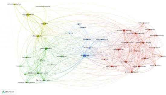 The keyword co-occurrence analysis provides an overview of fucoxanthin research concepts. Keywords serve as the fundamental of bibliographic research of academic literature []. A total of 40 relevant keywords were classified into four different clusters using a minimum occurrence of the 15-fold keyword (Figure 4). The first cluster (in red) consists of 18 keywords that revolved around “antioxidant activity”, “neuroprotection”, and “cancer inhibition”. This cluster highlighted the bioactivities of fucoxanthin via in vitro study and in vivo study. Ten keywords such as “photosynthesis”, “photosystem”, “chlorophyll-binding proteins”, and “energy transfer” were seen in the second cluster (in green). This cluster represents the research of photosynthesis that involved fucoxanthin. The third cluster (in blue) encompassed “chemistry”, “biosynthesis”, “extraction”, “purification”, and “biotechnology” keywords. Thus, this cluster depicted the optimization of processes in obtaining fucoxanthin as valuable compounds. The fourth cluster (in yellow) revolved around the major keywords such as “phytoplankton”, “community structure”, “pigment”, and “environmental monitoring”, which denoted the role of fucoxanthin in the environmental study of phytoplankton.
