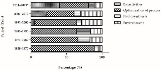 The four clusters (bioactivities, photosynthesis, optimization of process, environment) were utilized to analyze the fucoxanthin research trends from 1928 to June 2021. In the first period (1928–1970), the researchers focused on the optimization of process cluster (88.88%) (Figure 5). An equal percentage of fucoxanthin articles (5.56%) was observed in photosynthesis and environment clusters, respectively. No bioactivities of fucoxanthin publication were produced. In the second period (1971–1980), the percentage of articles in the optimization of process cluster decreased by 22.92% compared to the previous period. Both photosynthesis and environment clusters demonstrated the same percentage of publications, 17.02% (increased by 11.46%). The bioactivities cluster remained 0%. There was a further reduction (2.95%) of publications in the optimization of process cluster in the third period (1981–1990) compared to the previous period. In the same period, the bioactivities, photosynthesis, and environment clusters increased the percentage of publications, 1.37, 2.16, and 1.42%, respectively.