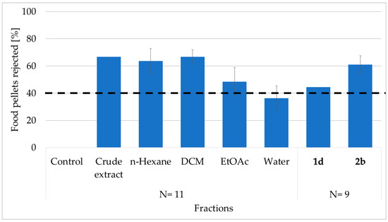 Feeding deterrence activity (%) of the crude extract, fractions (HEX, DCM, EtOAc, and H2O), and pure PBDEs (1d and 2b) of L. herbacea against the pufferfish C. solandri (N = number of specimens tested in the assays). Bars represent the percent of rejected food pellets by the pufferfish (mean ± SD). The dashed line at 40% refers to significance in deterrence p < 0.05 (Fisher’s exact test). Control pellets contained no extract (only MeOH).
