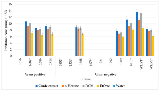 Total antibacterial activities of the crude extract and its organic fractions of the marine sponge L. herbacea. Y-axis shows inhibition zones in mm ± 1 SD for each tested strain. Gram-positive strains: 1656: Streptomyces flavoviridis; 1682 *: Rhodococcus corynebacterioides; 1686: Exiguobacterium profundum; 1714: Mycobacterium franklinii. Gram-negative strains: 0852 *: Acitenobacter soli; 1334 *: Aliagarivorans marinus; 1668: Ruegeria areniliotoris; 1678 *: Acinetobacter calcoaceticus; 1721: Microbulbifer variabilis; 1792: Pseudovibrio denitrificans; 1809: Ruegeria areniliticus; 1810 *: Pantoea eucrina; WHV1 *: Aurantimonas coralicida, WHV3 *: Vibrio mediterranei. (*): potentially pathogenic environmental bacteria.
