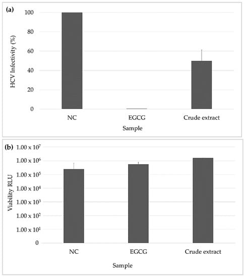 (a) shows the inhibition of infectivity by the Hepatitis C Virus (HCV). (b) illustrates the viability of Huh7.5 cells after the exposure of the tested crude extract. Bars represent the inhibition including the standard deviation (SD). MeOH was used as a negative control (NC), and epigallocatechin gallate (EGCG) was used as a positive control.