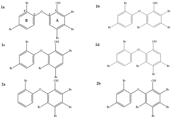 Four constitutional isomers of PBDEs are given to evaluate their 13C NMR chemical shift deviation (1a)–(1d) and to compare them to compound 1d from our work. Penta-BDE, 3,4,5,6-tetrabromo-2-(2′-bromophenoxy)phenol (2a) that was first reported by Salva and Faulkner [42] is shown as a comparison to compound 2b in our study.