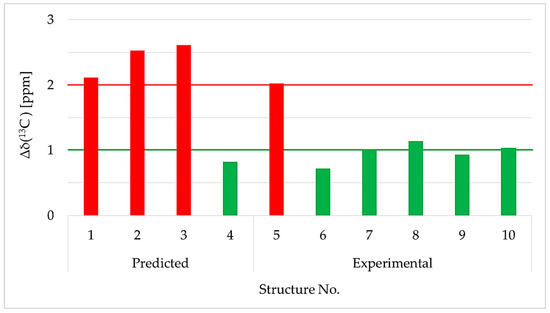 Comparison of the averaged 13C chemical shift deviations of the experimental to predicted values of constitutional isomers 1a to 1d (bars 1 to 4) and experimental data from the literature (bars 5 to 10). Bars 5 and 6 represent the two constitutional isomers described by Bowden et al., 2000 [50], which are identical to 1b and 1d in the current work. Green bars indicate deviations of 1 ppm or less (exception bars 8 and 10), whereas red bars indicate 2 ppm or higher deviations. Compound numbers were mentioned in the original publication: (5) Bowden et al., 2000 [50]—compound No. 1; (6) Bowden et al., 2000 [50]—compound No. 2 and Agarwal and Bowden 2005 [52] compound No. 3; (7) Fu and Schmitz 1996 [53]—compound No. 5; (8) Pedradab 2005 [54] compound No. 12; (9) Fu et al., 1995 [21]—compound No. 13; (10) Utkina et al., 2019 [55]—compound No. 2 (DMSO-d6).