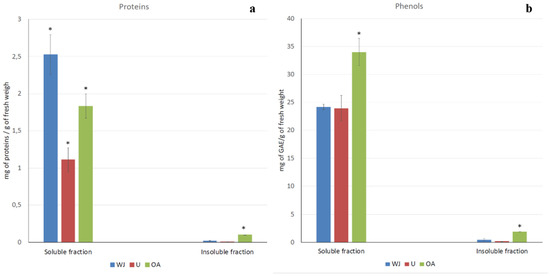 Total protein (a) and phenol (b) contents in the soluble and insoluble fractions of the jellyfish samples (WJ, whole jellyfish; U, umbrella; OA, oral arms). Protein content is expressed as mg of proteins per gram of fresh sample. Total phenolic content is expressed as mg of gallic acid equivalents (GAE) per gram of fresh weight. Data are means of three independent experiments performed in triplicate; bars represent ± standard deviation (SD). (* p < 0.05).