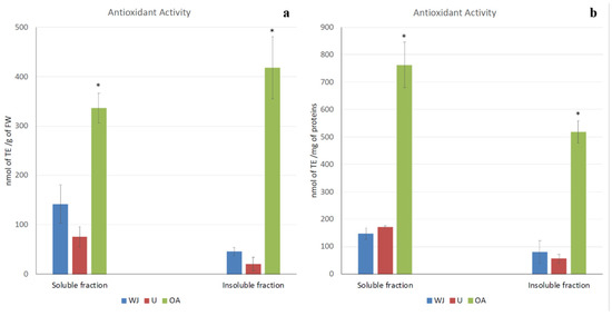 Total antioxidant activity in Aurelia coerulea jellyfish samples. Soluble and insoluble fractions of the whole jellyfish (WJ), umbrellas (U), and oral arms (OA) were considered. Antioxidant activity is expressed as nmol of Trolox eq. (TE) per g of fresh weight (a) or as nmol of Trolox eq. (TE) per mg of proteins (b). Data are the mean of three independent experiments performed in triplicate; bars represent mean ± standard deviation. (* p < 0.05).