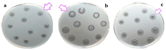 Standard assay on Petri dish inoculated with Micrococcus luteus cell walls to detect the lysozyme-like activity of A. coerulea mucus (a), oral arms (b), and umbrella (c). The arrows indicate the lysis diameter around each well.