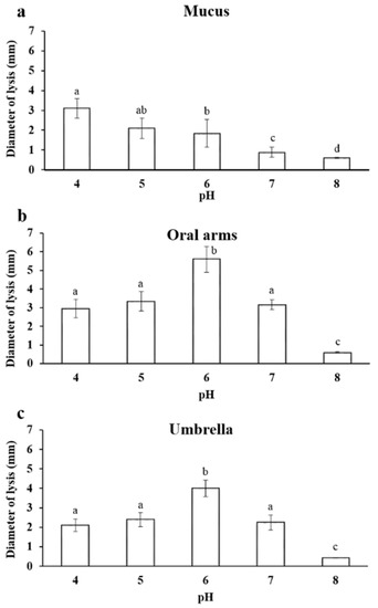 Effect of pH (4, 5, 6, 7, 8) on the lysozyme-like activity of A. coerulea mucus (a), oral arms (b), and umbrella (c). Data are reported as mean value ± standard deviation. Sharing letters indicate absence of significant differences.