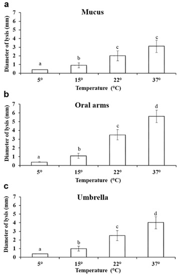 Additionally, in the oral arms homogenate, a significant increase in the lysis diameter was observed when the temperature increased (Figure 6). At 5 °C, the lysis diameter was 0.4 ± 0.1 mm. At 15 °C, the lysis diameter was 1.1 ± 0.2 mm, and at 22 °C, it was 3.5 ± 0.42 mm. The largest lysis diameter (5.6 ± 0.5 mm) was recorded at 37 °C (Figure 6b).