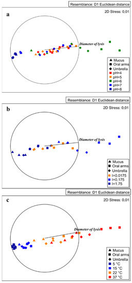 MDS plot of the lysozyme-like activity detected in the A. coerulea mucus, oral arms, and umbrella homogenates showing the effects of pH (a), ionic strength (b), and temperature (c) on the lysis diameter.