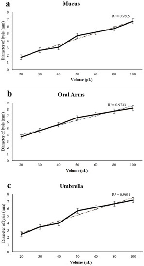 A dose–response curve was obtained when increasing the amounts of the mucus, oral arms, and umbrella, respectively, which were used to test the lysozyme-like activity (Figure 8). The diameter of the lysis was positively correlated with the employed volume of the mucus, oral arms, and umbrella samples (Figure 8).