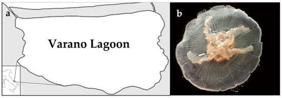 Varano Lake (41° 52′45.01″ N, 15°44′46.00″ E) is located on the southern Adriatic Sea on the north side of the Gargano promontory (Apulia region, Italy, Figure 9). The lagoon area covers approximatively 60.5 km2 and reaches a maximum depth in the central zone of 5 m. Here, a resident population of Aurelia coerulea was recorded throughout the year, with high densities of jellyfish being present in spring and summer months, when the population abundance was estimated to be 4.5 ind/m2 [28].