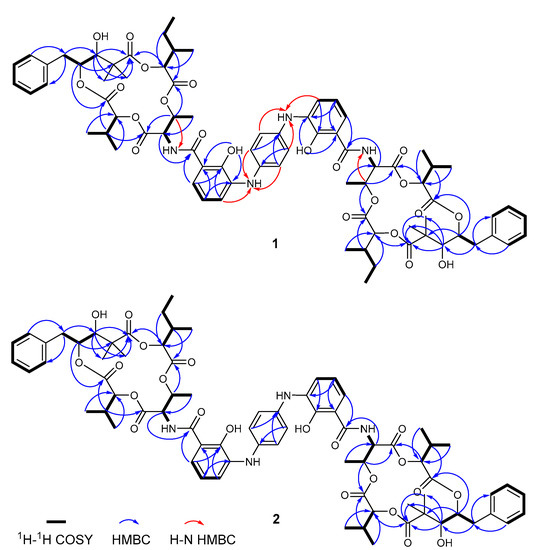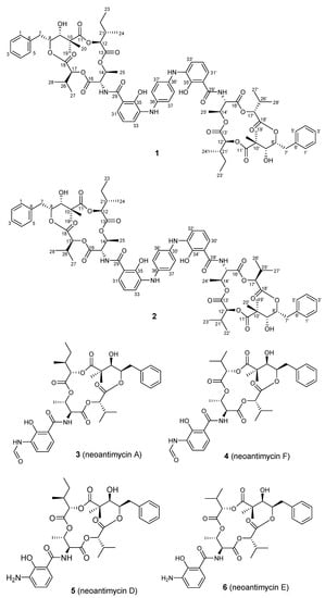 The relative stereochemistry of 1 and 2 was established by NOESY (Figure S7 and Figure S15) NMR spectrum analysis, which implied that 1 and 2 have the same configurations as those reported for neoantimycin A–F [12,13]. The optical rotation of 1 (+100, c 0.1, MeOH) and 2 (+90, c 0.1, MeOH) were also similar to those of neoantimycin D (5) and E (6) [12], which were co-isolated from the extract. Taking this into consideration, the absolute structures of 1 and 2 were assigned, as shown in Figure 1, on the basis of a common biosynthetic origin shared with 5 and 6.