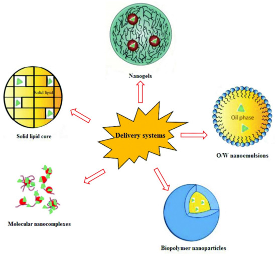 Schematic representation of nano-sized delivery systems, replicated from Qi et al. [71] with permission.