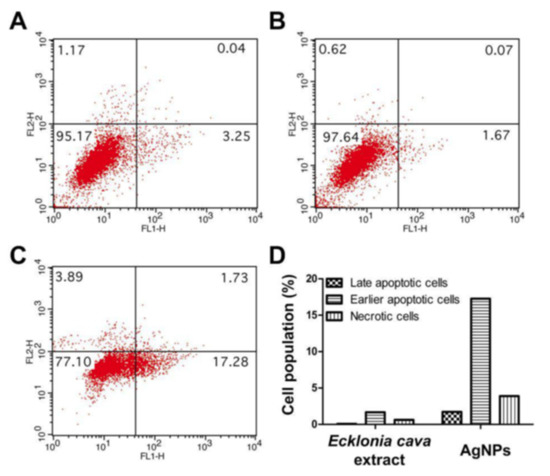 Annexin/PI staining of: (A) untreated HeLa cells; (B) HeLa cells treated with 250 μg/mL of E. cava extracts; (C) HeLa cells treated with 250 μg/mL of biosynthesized AgNPs; and (D) relative cell population of HeLa cells after treatment with E. cava extracts and biosynthesized AgNPs. Replicated from Shim et al. [69] with permission.