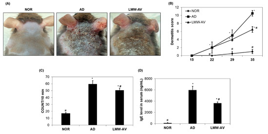 Effects of LMW-AV on development of dermatitis. (A) Pictures of the clinical observations on the back of mice. (B) Evaluation of clinical dermatitis induced by Biostir-AD ointment. (C) Scratching behavior was assessed on the last day of the study (day 35). (D) Effects of LMW-AV on serum IgE level. Each column shows the mean ± SD of 5 mice. * p < 0.05 indicates significant differences compared with the NOR group and # p < 0.05 indicates significant differences compared with the AD group.