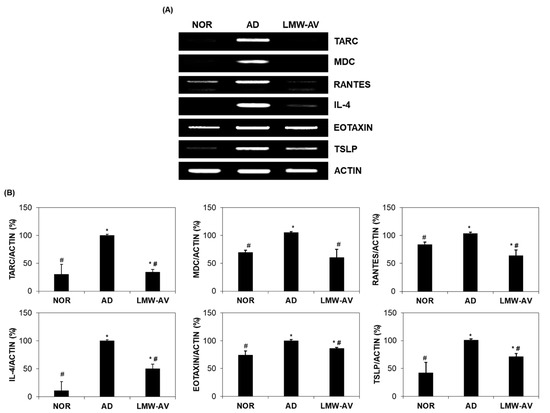 Effect of the LMW-AV on mRNA expression of cytokine and several chemokines on AD-like skin lesions stimulated with Biostir-AD ointment. (A) Gel images and (B) graphs of relative mRNA expression level of cytokines and chemokines were obtained by RT-PCR analysis. Actin mRNA expression levels were used to confirm the equal amounts of RNA used for cDNA synthesis. Each column shows the mean ± SD of five mice. * p < 0.05 indicates significant differences compared with the NOR group and # p < 0.05 indicates significant differences compared with the AD group.